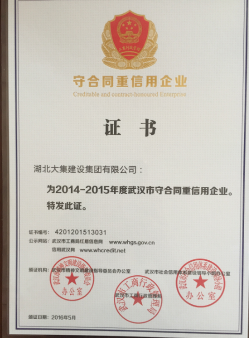 2016年7月21日上午,武漢市工商行政管理局委托蔡甸區(qū)工商管理局領導向湖北大集建設集團有限公司董事長徐濤頒發(fā)2014-2015年度“守合同重信用企業(yè)”榮譽證書,我公司已連續(xù)十二年榮獲此項殊榮!