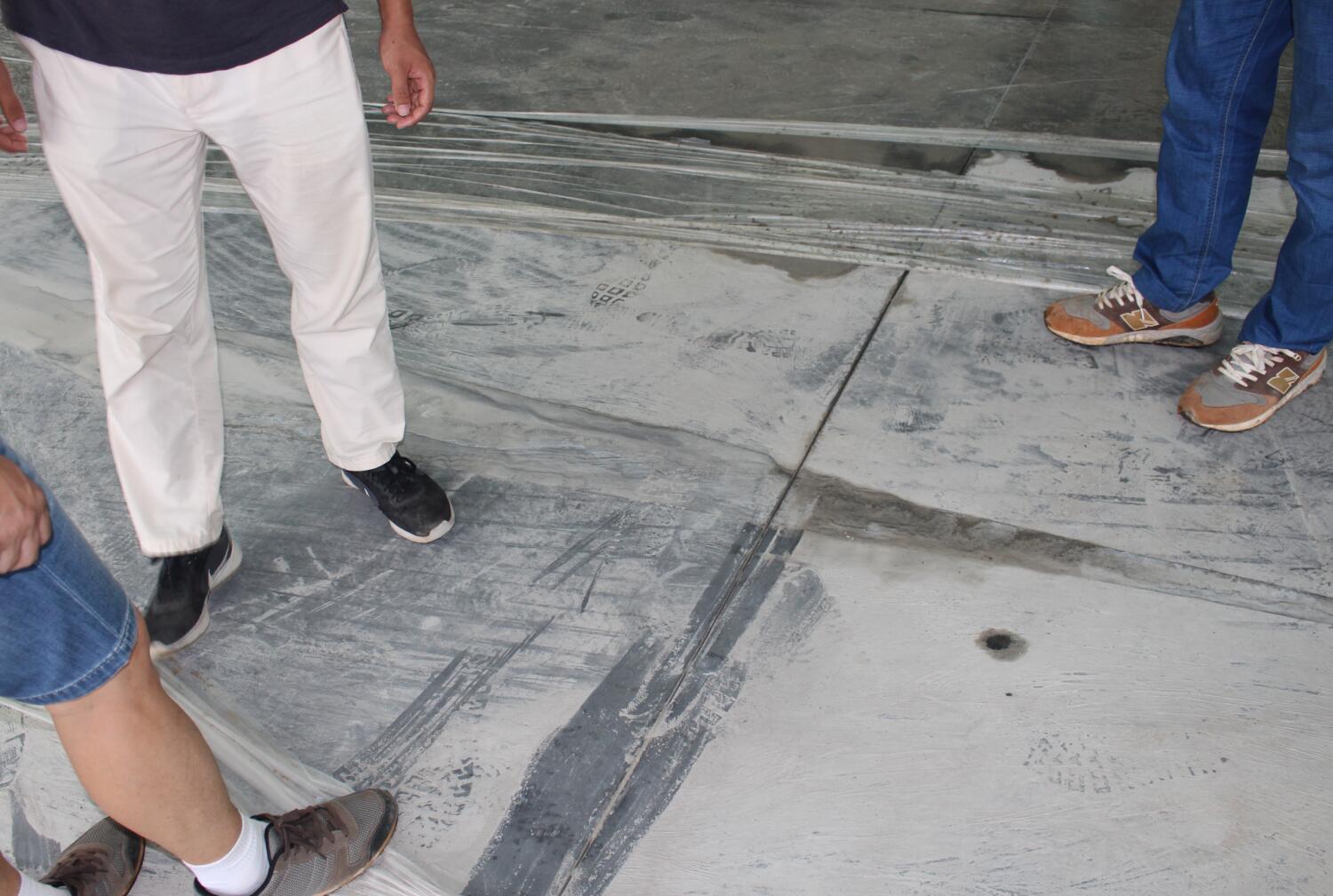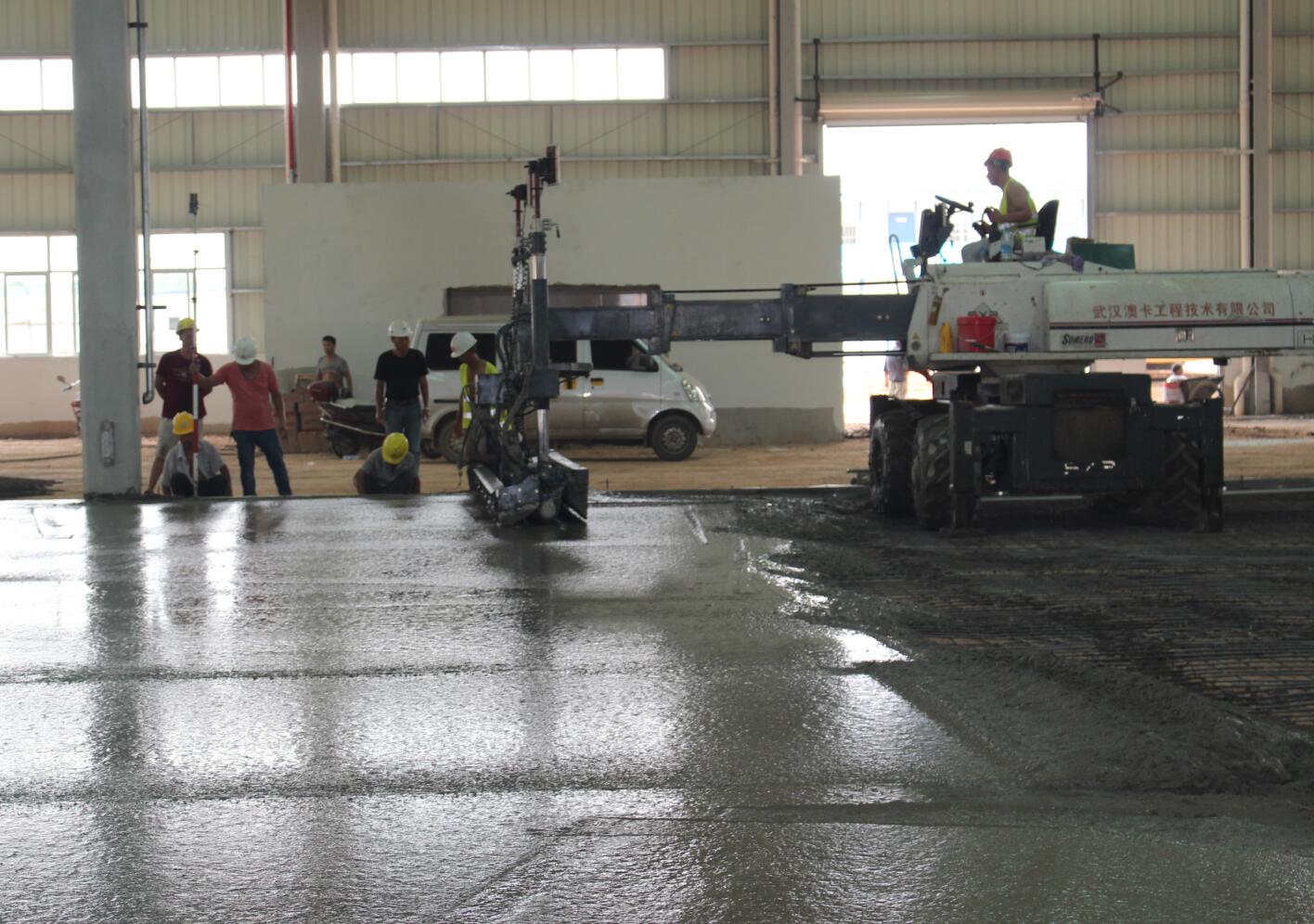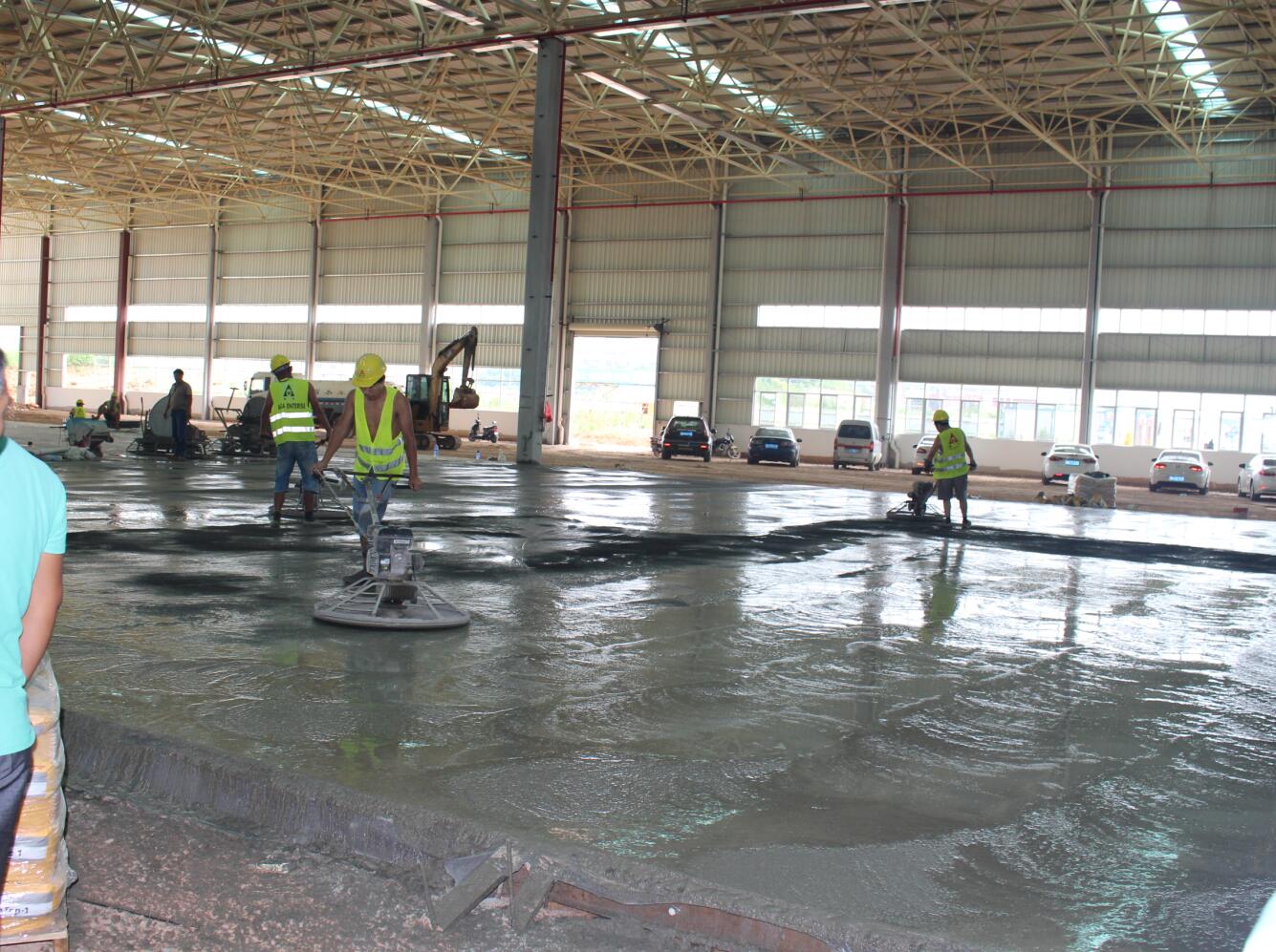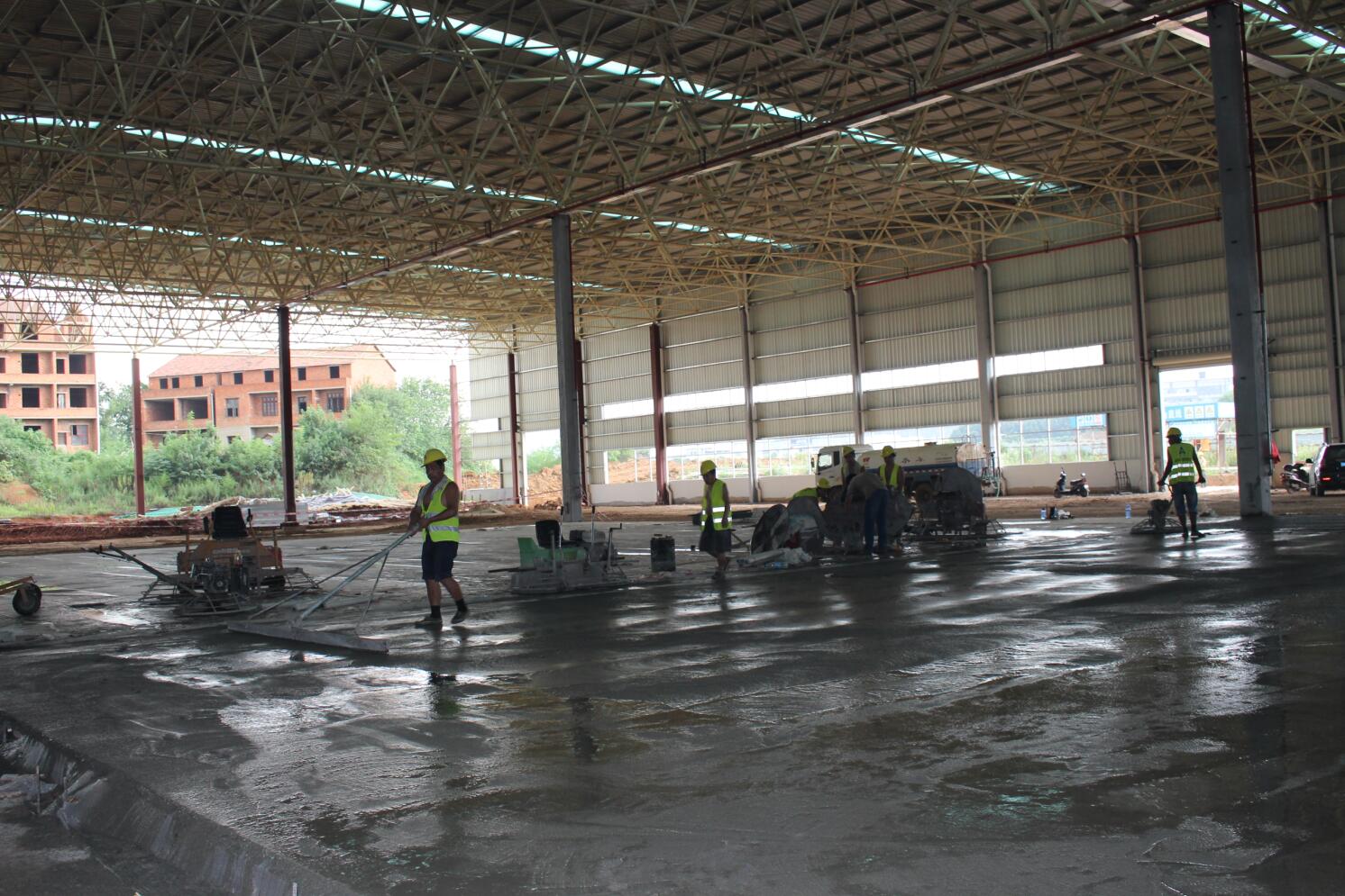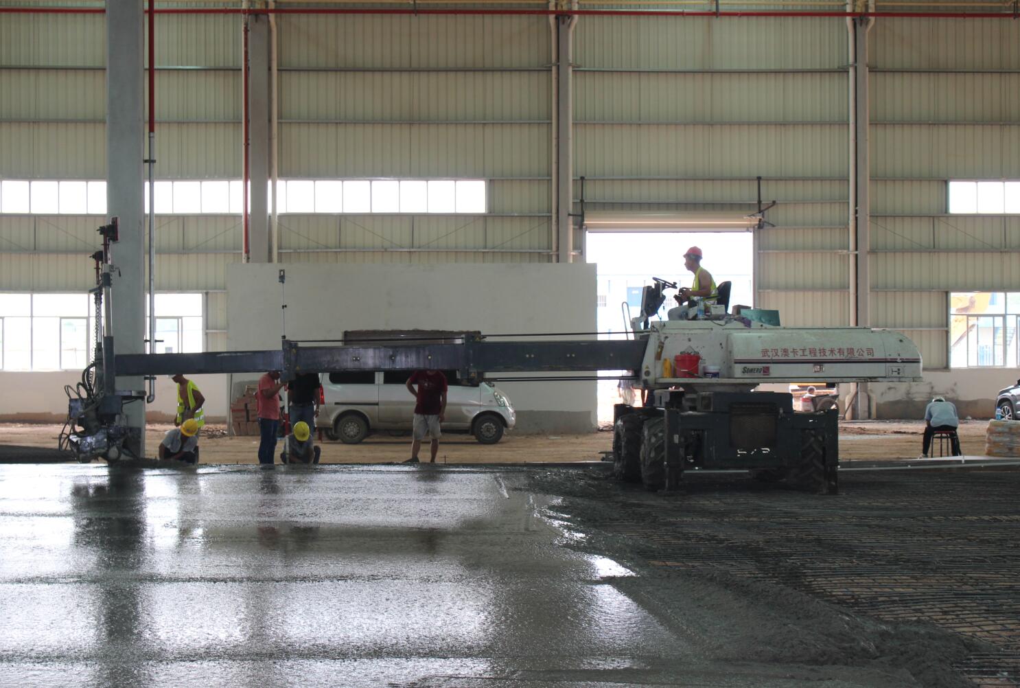 億和中建鋼構項目率先在地平混凝土現場引進激光振坪儀和磨光機,不僅在效率上大大縮短了施工時間,降低了人工成本,更是在效果上達到了比人工更為精準的技藝——混凝土的平整度、密實度、觀感度以及面層金剛砂顆粒分布度優(yōu)良,高低差控制在3~4mm。