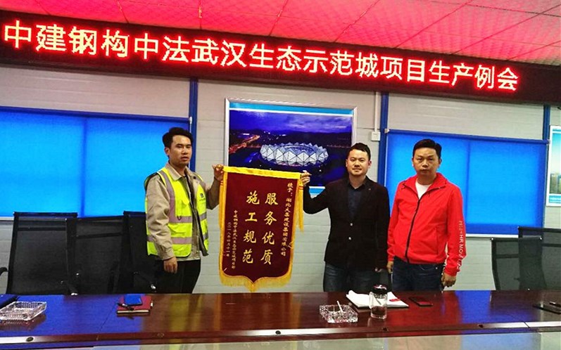 2018年4月13日,由集團(tuán)公司參與承建的中法新城規(guī)劃館項(xiàng)目獲得中建鋼構(gòu)嘉獎(jiǎng),授予“施工規(guī)范,服務(wù)優(yōu)質(zhì)”的錦旗,項(xiàng)目經(jīng)理徐斌和工程部副部長(zhǎng)陳超共同接受了這一榮譽(yù)。