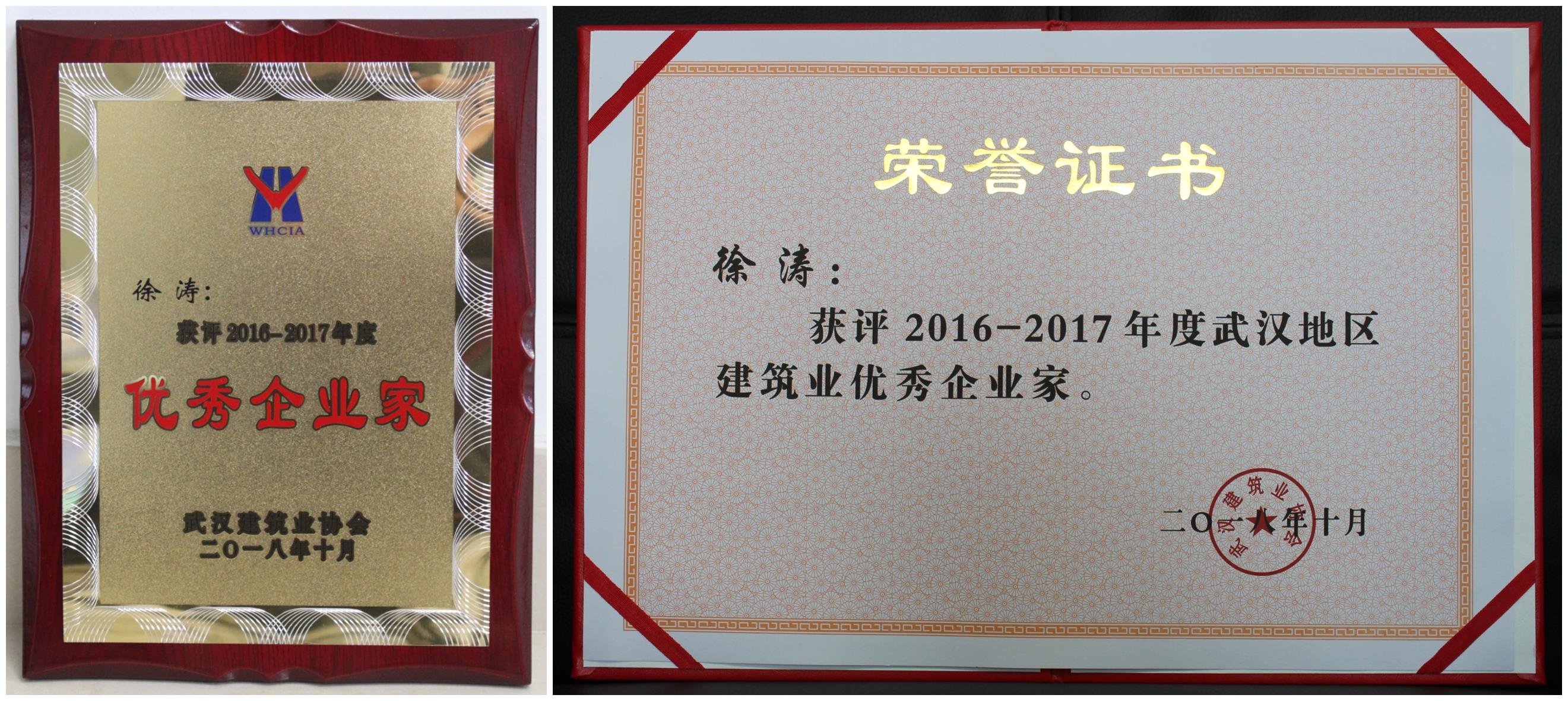 董事長(zhǎng)徐濤榮獲“2016-2017年度武漢地區(qū)建筑業(yè)優(yōu)秀企業(yè)家”稱號(hào)