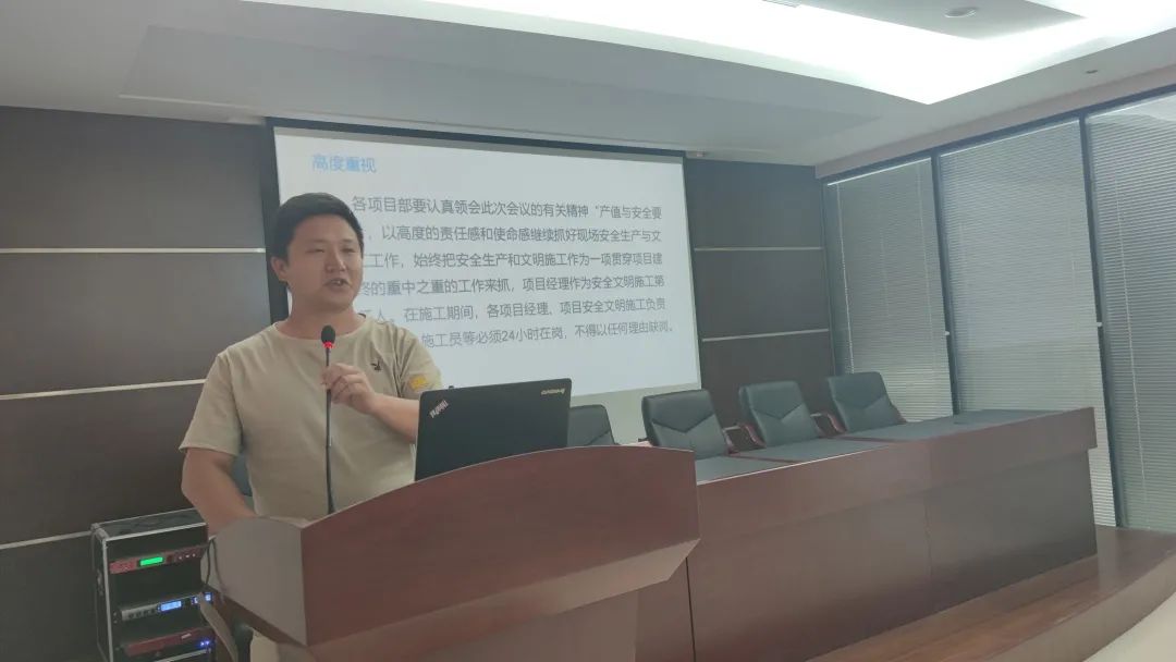 緊接著,工程部安全主管秦春波表明安全生產(chǎn)的重要性并進行了詳細說明,提出了安全第一、強化意識、教育培訓(xùn)、預(yù)防為主、防治結(jié)合的安全施工理念,著重講述細微的安全隱患,讓各位項目工作人員引起重視。