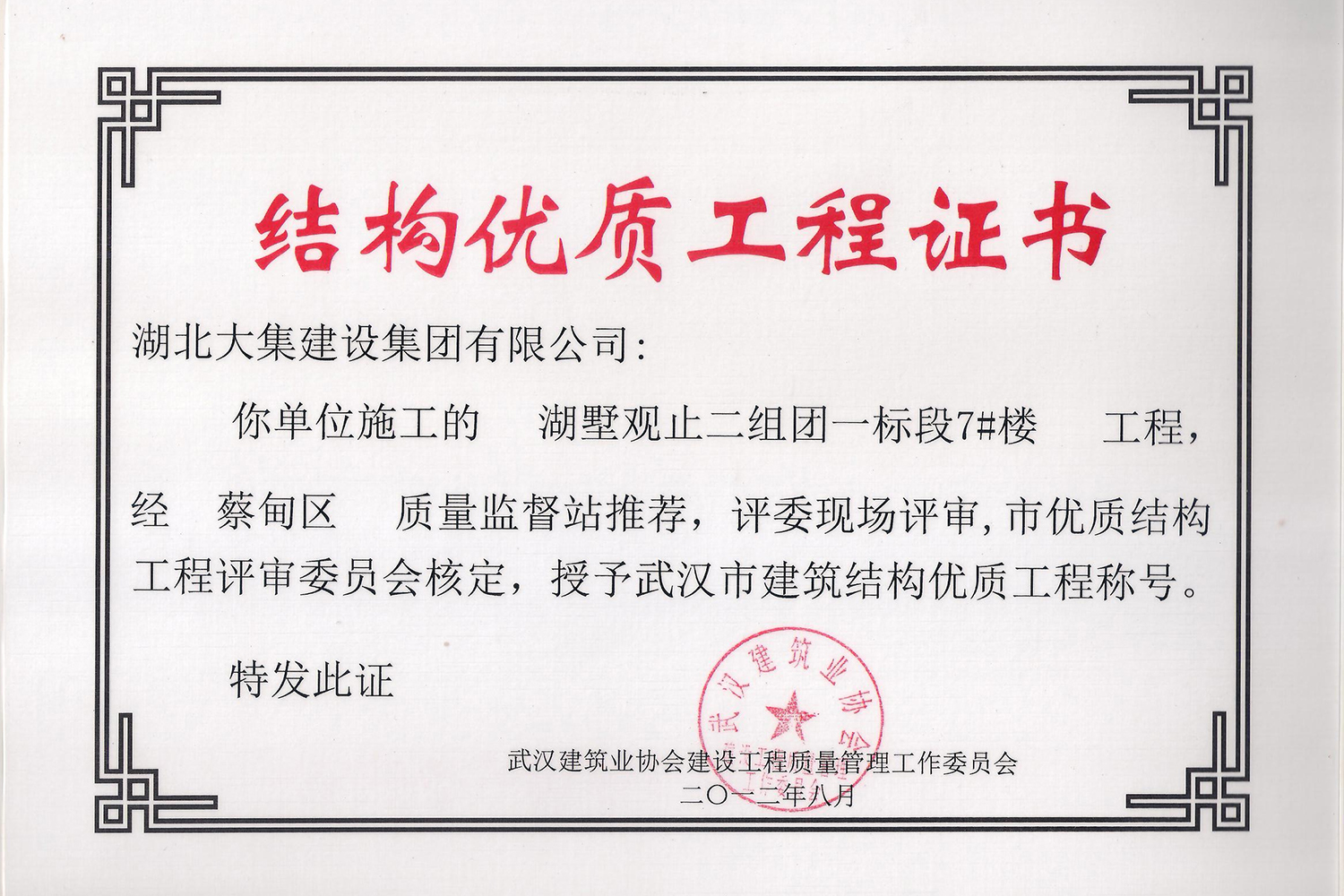集團(tuán)秉持“安全是紅線,質(zhì)量是品牌,文明施工是形象”的企業(yè)宗旨,不斷加強(qiáng)全面管理,注重提高自身素質(zhì),以完美的履約、優(yōu)良的質(zhì)量、滿意的服務(wù),贏得了信譽(yù)。近年來(lái),湖北大集建設(shè)集團(tuán)先后與中石化集團(tuán)、中鐵上海工程局、中建八局、中鐵十二局、碧桂園集團(tuán)、世茂集團(tuán)、綠地集團(tuán)等央企、國(guó)企、地方標(biāo)志性建設(shè)單位合作,先后承建了“碧桂園知音豪庭”項(xiàng)目、“碧桂園光谷云境”項(xiàng)目、“大集G區(qū)蓮溪花園”項(xiàng)目等多個(gè)高層住宅小區(qū);承建了世茂龍灣46#、47#、48#地塊、花博匯桃李春風(fēng)二期等多個(gè)精品高端別墅群項(xiàng)目;承建了“南湖中學(xué)”、“南湖小學(xué)”、“南湖幼兒園”、“博奧幼兒園”等多個(gè)教育配套項(xiàng)目;承建了“孝感英眾超算終端科技產(chǎn)業(yè)園”、“鴻盛華全球航空服務(wù)產(chǎn)業(yè)園”、“盟盛汽車產(chǎn)業(yè)園”、“中原印務(wù)晶毅”等多個(gè)具有特殊設(shè)備安裝需求的鋼、混結(jié)構(gòu)工業(yè)廠房項(xiàng)目;承建了“常福商務(wù)廣場(chǎng)”等大型商業(yè)綜合體;承建了后官湖綠道二期、三期,常貴路西延伸段、黃星大道等多條大型道路市政項(xiàng)目;自主開發(fā)了“聚盛晶尚”住宅項(xiàng)目,改善人居環(huán)境,引領(lǐng)綠色棲居新領(lǐng)域;所有工程嚴(yán)格執(zhí)行施工作業(yè)全過(guò)程質(zhì)量、安全管理,多個(gè)項(xiàng)目被省、市級(jí)監(jiān)管單位授予“省結(jié)構(gòu)優(yōu)質(zhì)”、“省安全文明施工現(xiàn)場(chǎng)”、“市結(jié)構(gòu)優(yōu)質(zhì)”、“市安全文明施工示范項(xiàng)目”、“樣板工地”等榮譽(yù)稱號(hào)。