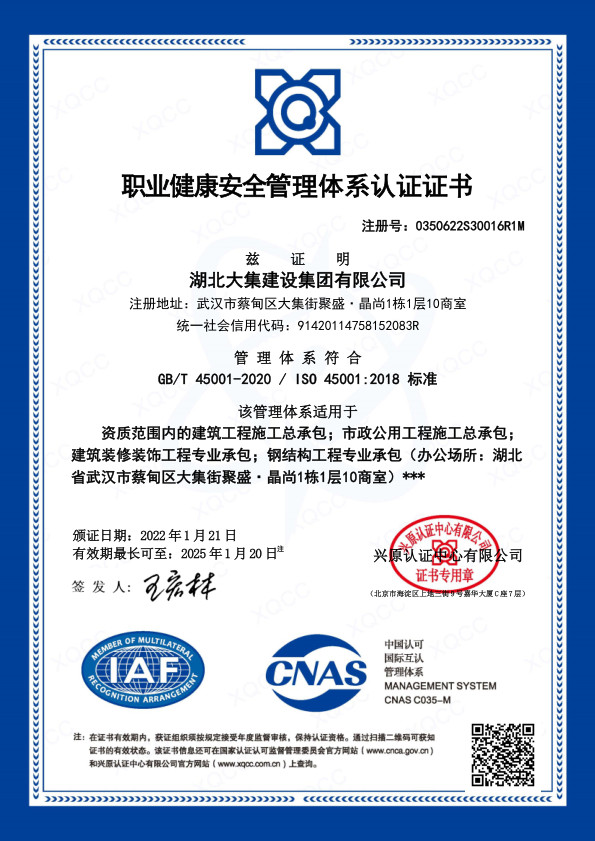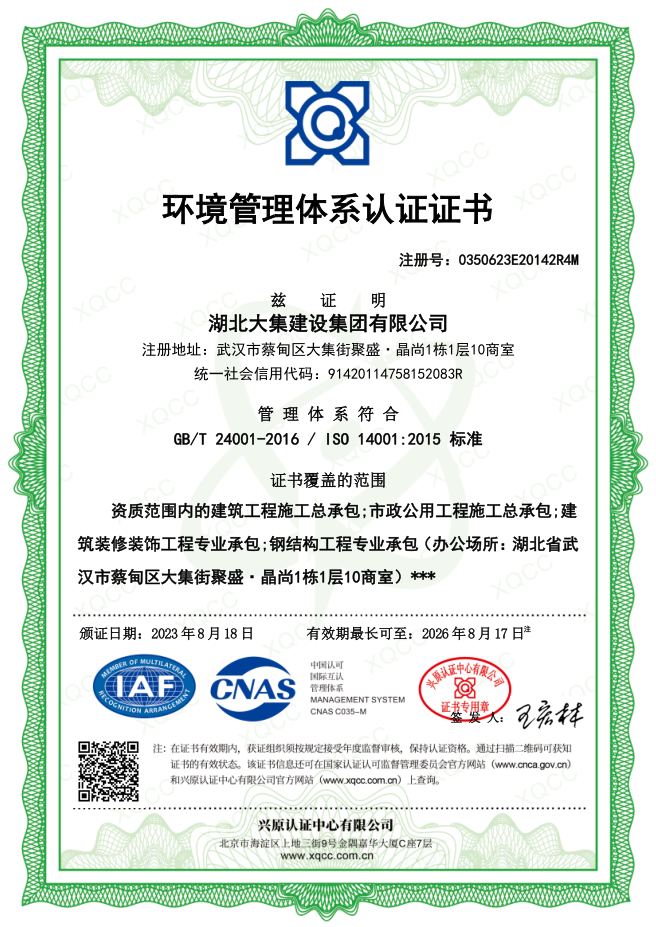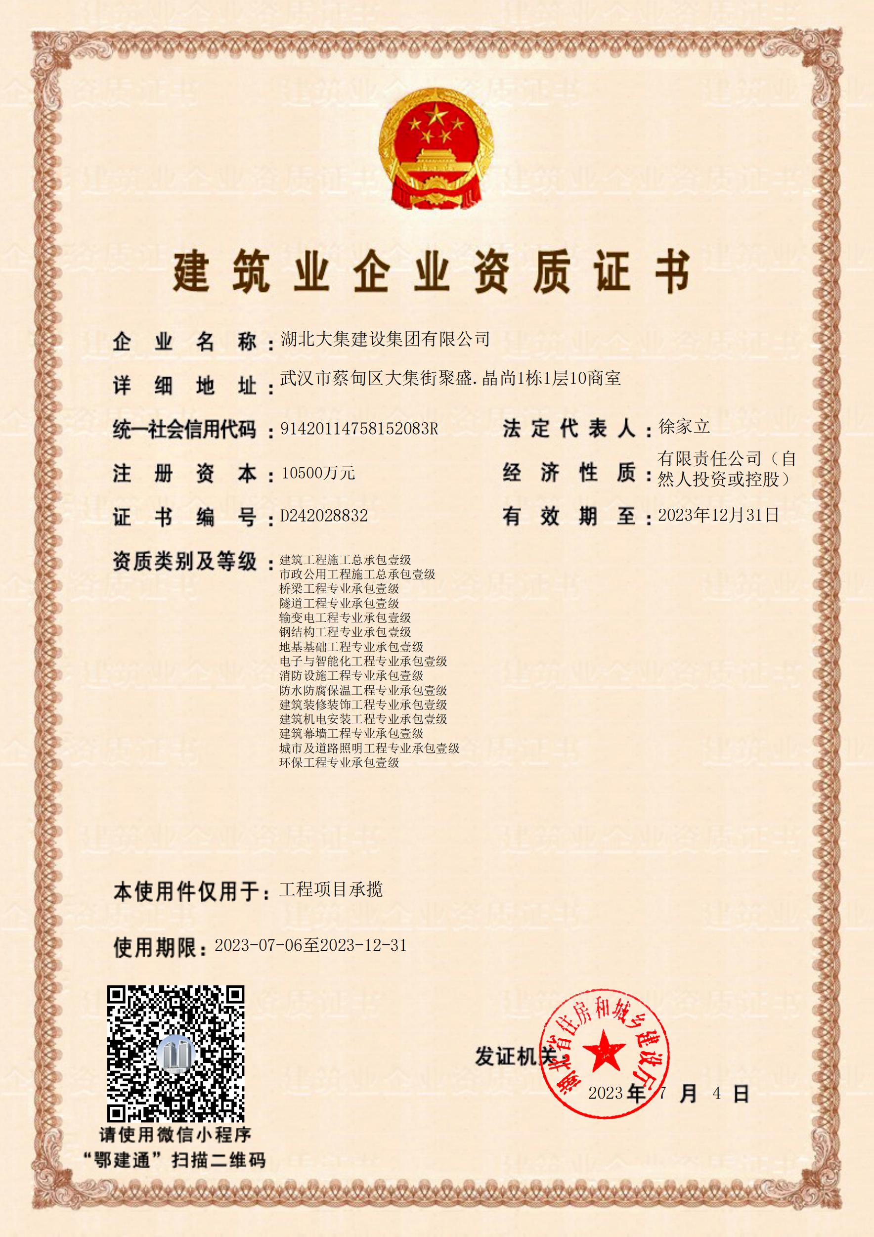 湖北大集建設(shè)集團(tuán)有限公司成立于1990年,注冊(cè)資本10500萬(wàn)元,是武漢市蔡甸區(qū)本土建筑行業(yè)的龍頭企業(yè),在行業(yè)內(nèi)具有一定的品牌影響力。擁有建筑工程施工總承包一級(jí)、市政公用工程施工總承包一級(jí)、橋梁工程專業(yè)承包一級(jí)、隧道工程專業(yè)承包一級(jí)、輸變電工程專業(yè)承包一級(jí)、鋼結(jié)構(gòu)工程專業(yè)承包一級(jí)、地基基礎(chǔ)工程專業(yè)承包一級(jí)、電子與智能化工程專業(yè)承包一級(jí)、建筑裝修裝飾工程專業(yè)承包一級(jí)等多項(xiàng)資質(zhì)?,F(xiàn)已形成“建筑施工、園林綠化、文化旅游、房地產(chǎn)開發(fā)與物業(yè)管理”四大產(chǎn)業(yè)格局,并通過(guò)了行業(yè)和國(guó)家質(zhì)量管理體系、環(huán)境管理體系和職業(yè)健康安全管理體系認(rèn)證,三大安全管理體系日臻完善,是一家綜合力較強(qiáng)的綜合性建筑施工企業(yè)。