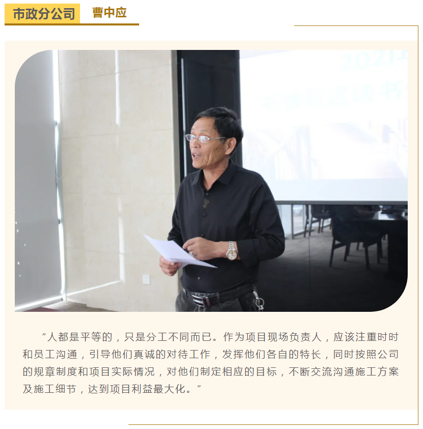 此次中高層領(lǐng)導(dǎo)共讀并分享的書籍是《麥肯錫團(tuán)隊(duì)管理法》,集團(tuán)公司七位部門負(fù)責(zé)人依次上臺,結(jié)合各自的實(shí)際工作、管理經(jīng)驗(yàn)等,對書中的觀點(diǎn)進(jìn)行闡述與分析。在思想交流碰撞中,各位部門負(fù)責(zé)人進(jìn)一步加深了對團(tuán)隊(duì)管理的認(rèn)識,反思了自己在部門管理中存在的問題,了解了更多的管理細(xì)節(jié),學(xué)習(xí)了更有效的管理方法,為今后更好地完成日常管理工作打下了堅(jiān)實(shí)的基礎(chǔ)。