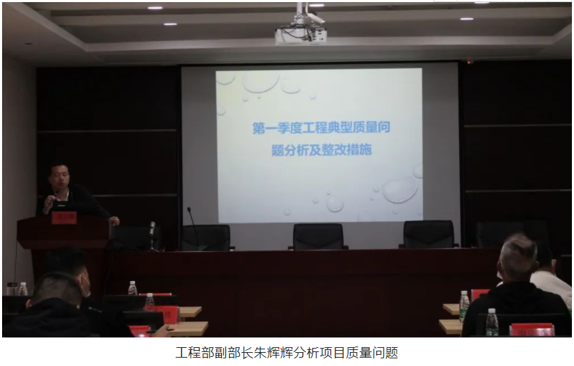 隨后,會(huì)議進(jìn)入質(zhì)量、安全隱患分析環(huán)節(jié),工程部副部長朱輝輝及安全主管秦春波采用PPT通報(bào)問題的方式,照片配合講述,更直觀的把項(xiàng)目質(zhì)量、安全隱患問題展現(xiàn)在大家面前,朱工和秦工結(jié)合項(xiàng)目現(xiàn)場存在的質(zhì)量、安全問題,著重分析了問題產(chǎn)生的原因以及現(xiàn)場的安全管理情況,并逐一對(duì)各項(xiàng)目提出了相應(yīng)的整改措施。