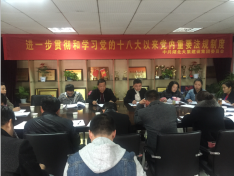 為了深入貫徹落實黨的十八屆六中全會精神,增加思想政治教育,加強黨的知識普及,2016年11月21日下午,湖北大集建設(shè)集團黨委組織全體黨員同志在集團會議室集中學(xué)習(xí)《中國共產(chǎn)黨章程》、《中國共產(chǎn)黨廉潔自律準(zhǔn)則》、《關(guān)于新形勢下黨內(nèi)政治生活的若干準(zhǔn)則》、《中國共產(chǎn)黨紀律處分條例》等黨內(nèi)文件和重要法規(guī)制度。